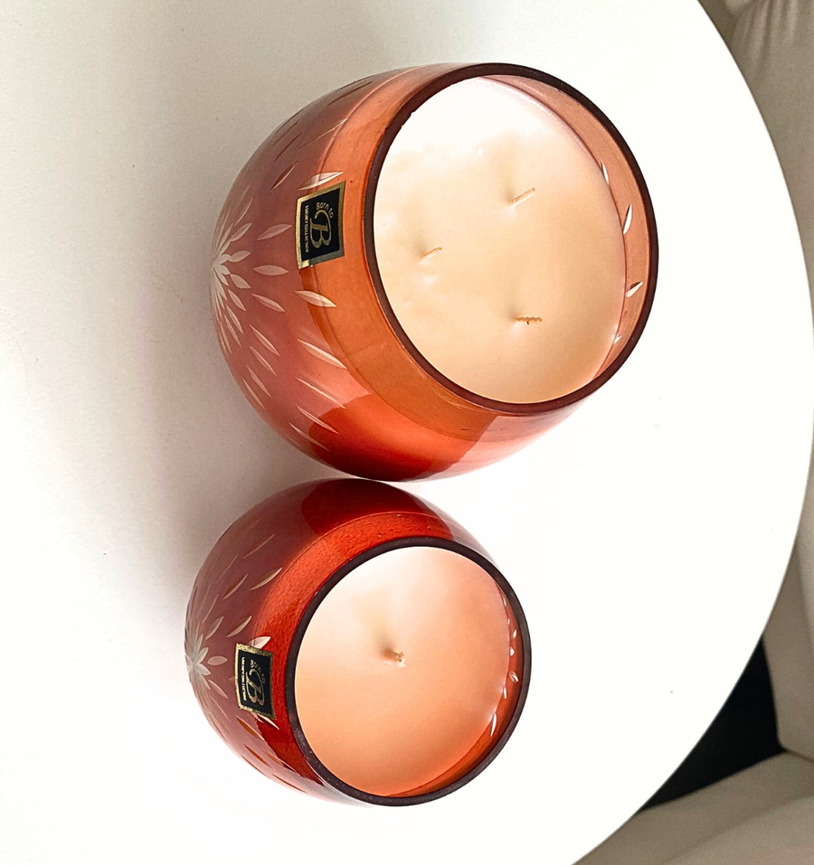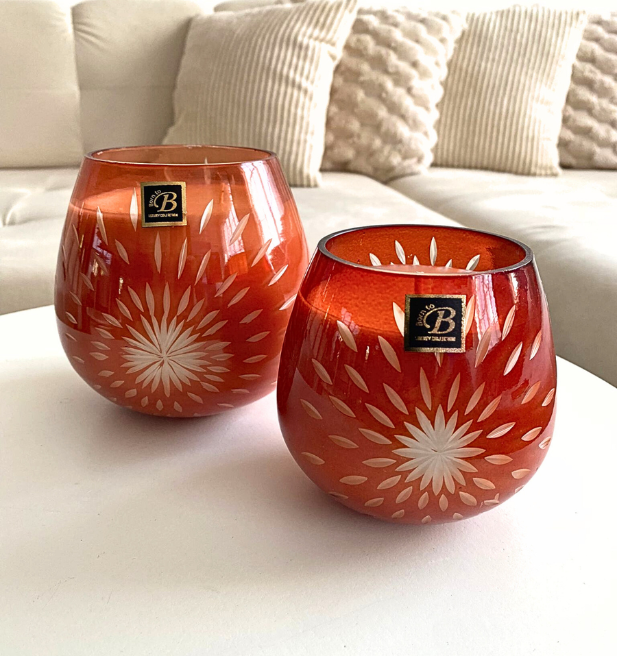 Le verre ambré, délicatement incrusté d’un motif floral éclatant, se pare de mille reflets lorsque la flamme s’anime. Chaque pièce est unique: une œuvre d’art artisanale qui diffuse une lumière dorée et hypnotique, évoquant les lanternes orientales des soirs d’été.