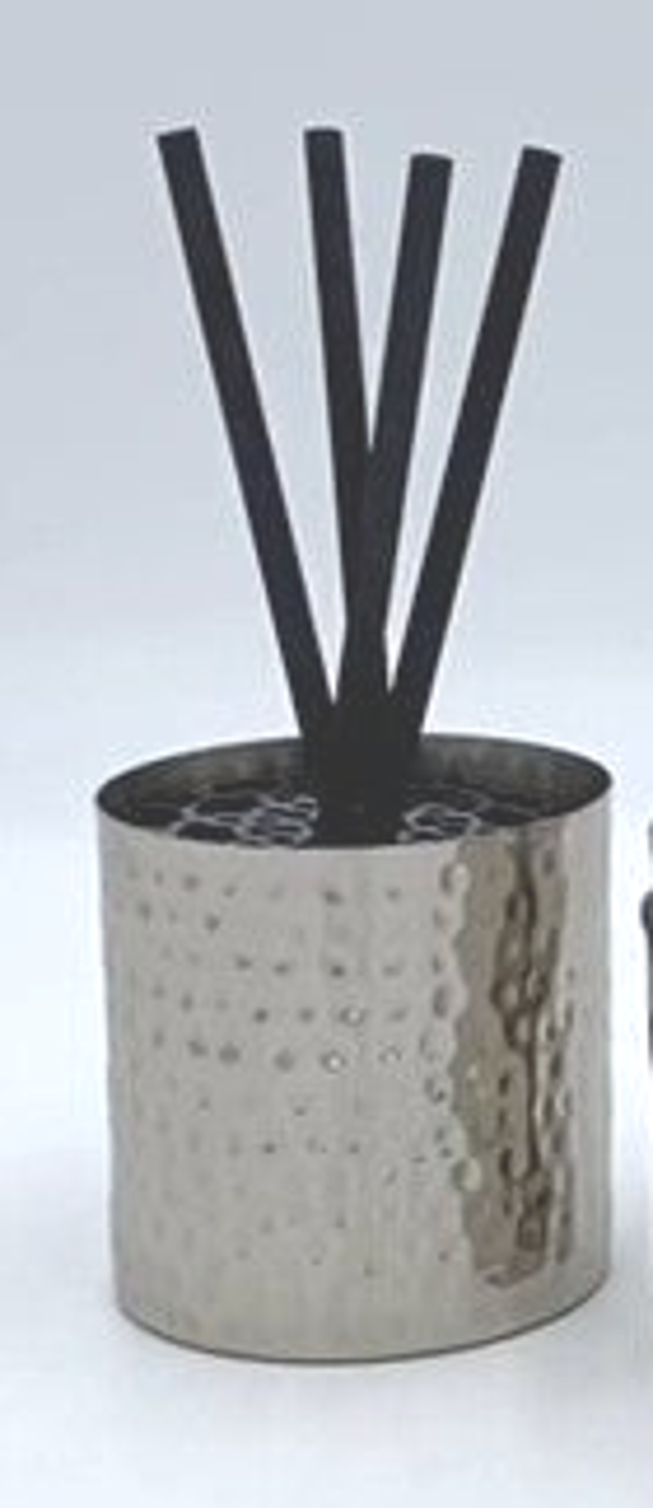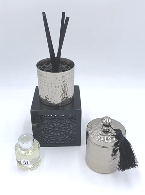Notre diffuseur à batônnets Galbi est présenté dans un contenant en métal de couleur argéntée surmonté d'un cache en acrylique noir dessiné et découpé par nos soins.