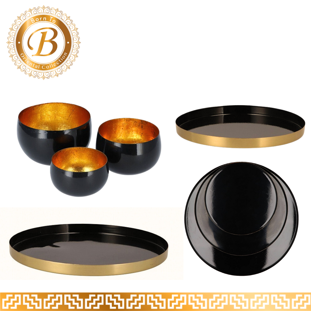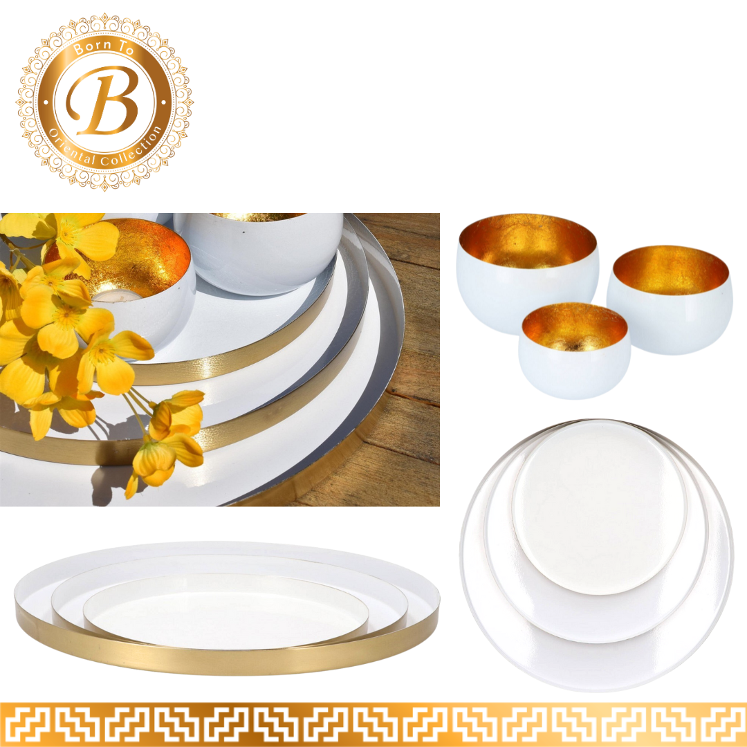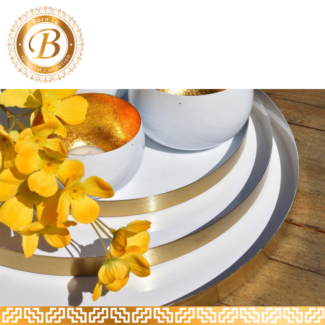 Ronde presentatietrays van gekleurd metaal met een gouden buitenrand om uw interieur of uw tuinfeesten te verfraaien. Zeer stevig en ideaal om te serveren of als decoratief item om een kaars, een diffuser, een vaas of een kaarsenpot te sublimeren.