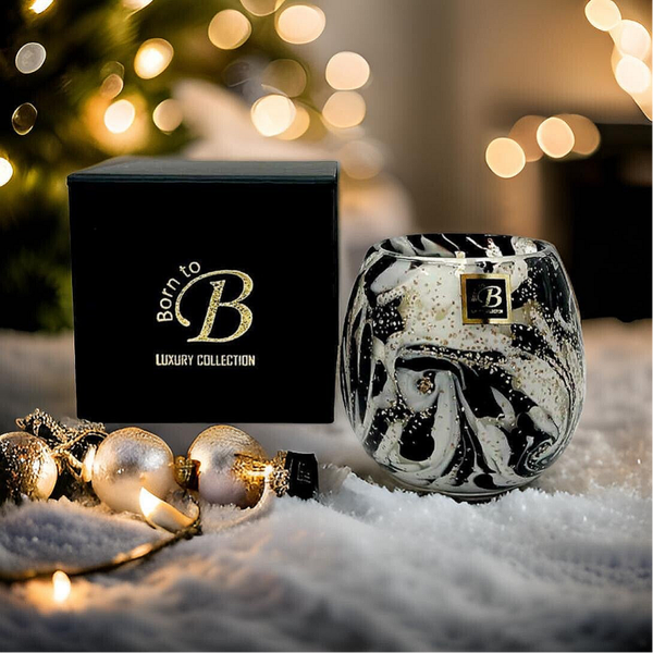 Chaque bougie est coulée à la main avec une cire végétale de soja de la plus haute qualité et des parfums de Grasse, contenant 10 % de parfum pur pour une sensation olfactive maximale. Présentées dans des contenants en verre artisanal soufflé à la bouche en Italie, chaque pièce est unique, arborant un dégradé de blanc et noir parsemé de poudre d'or. Nos bougies sont présentées dans leur boîte cadeau de luxe magnétique.