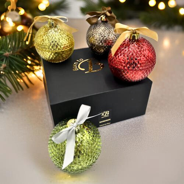 La Collection Sparkling est élégamment présentée dans un contenant en verre en forme de boule de Noël d’un diamètre de 12 cm, parfait pour apporter une touche de fête à votre décoration.