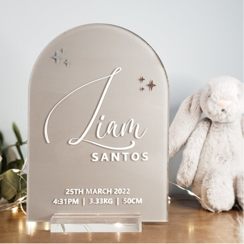 Panneau avec Prénom et Informations de Naissance | Arche en Acrylique avec Support | Annonce de Naissance et Décoration de Chambre de Bébé