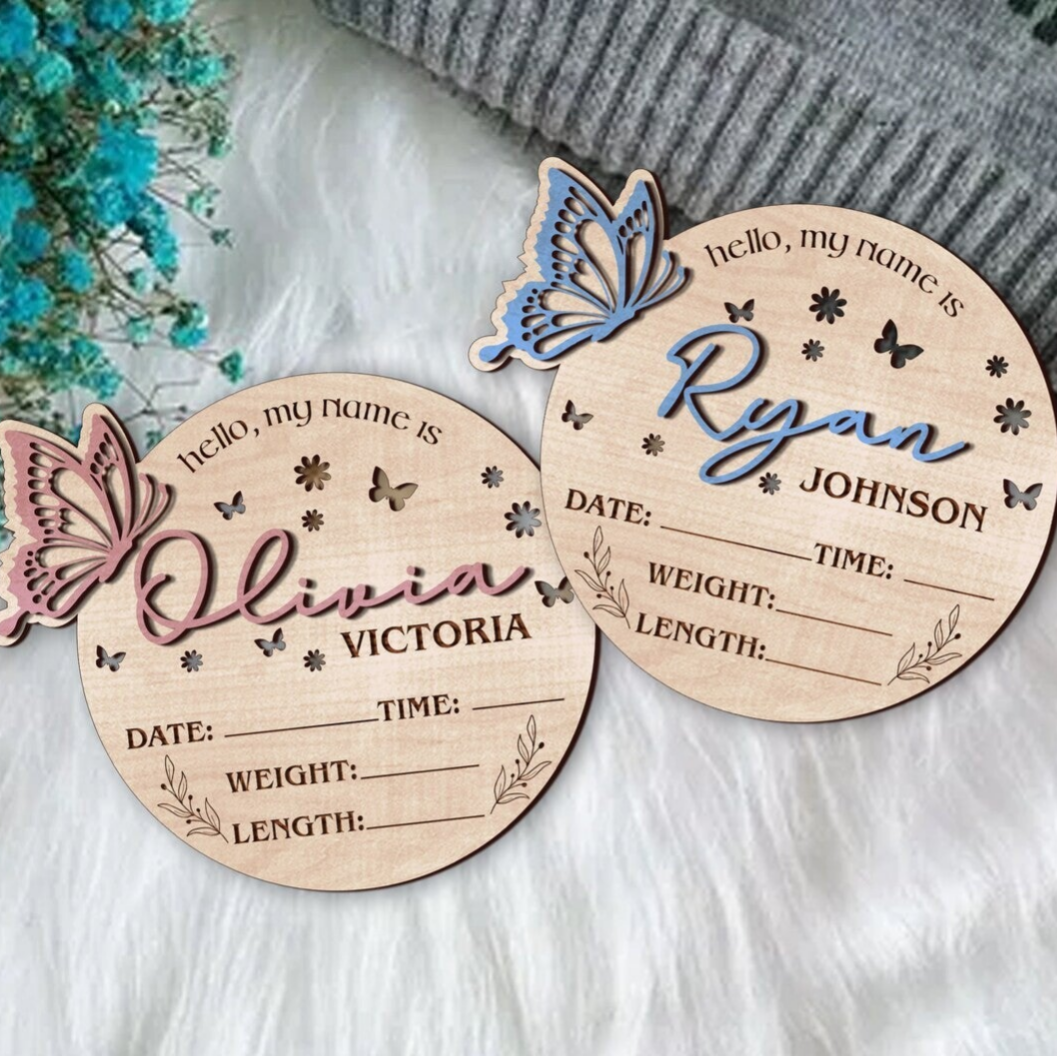 Panneau avec Prénom et Informations de Naissance | Support en bois naturel | lettrage acrylique 3D + vynil | Annonce de Naissance et Décoration de Chambre de Bébé