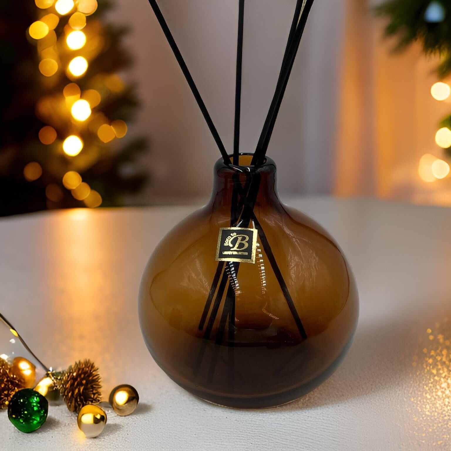 - Design : Contenant en verre brun avec une boîte cadeau noire élégante et ses bâtonnets en fibre noirs