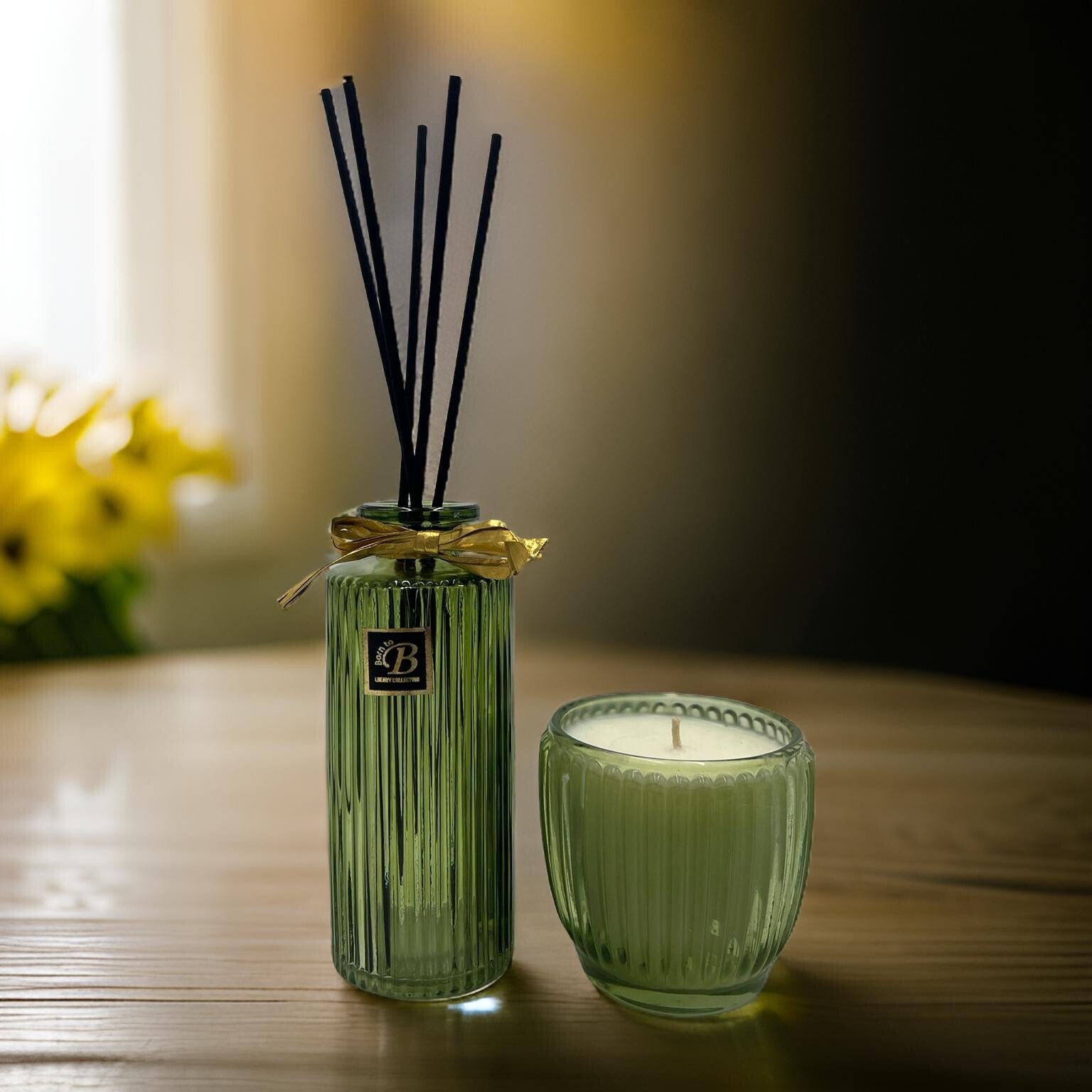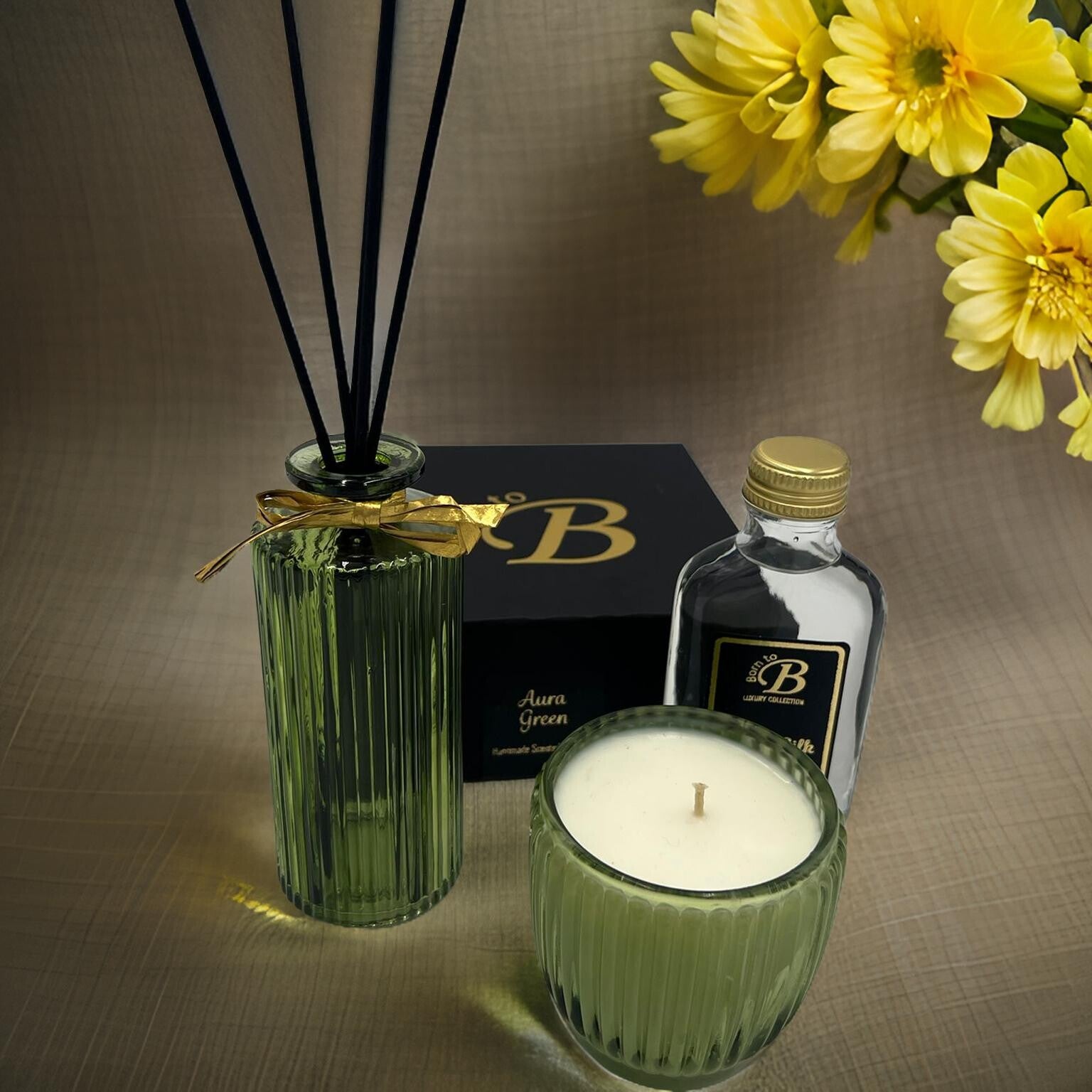 Composée d’une bougie parfumée de 110 g et d’un diffuseur assorti de 100 ml, présentés dans de superbes verres striés au coloris orange tendance, la Aura Mixed Box Green incarne l’élégance et le raffinement.