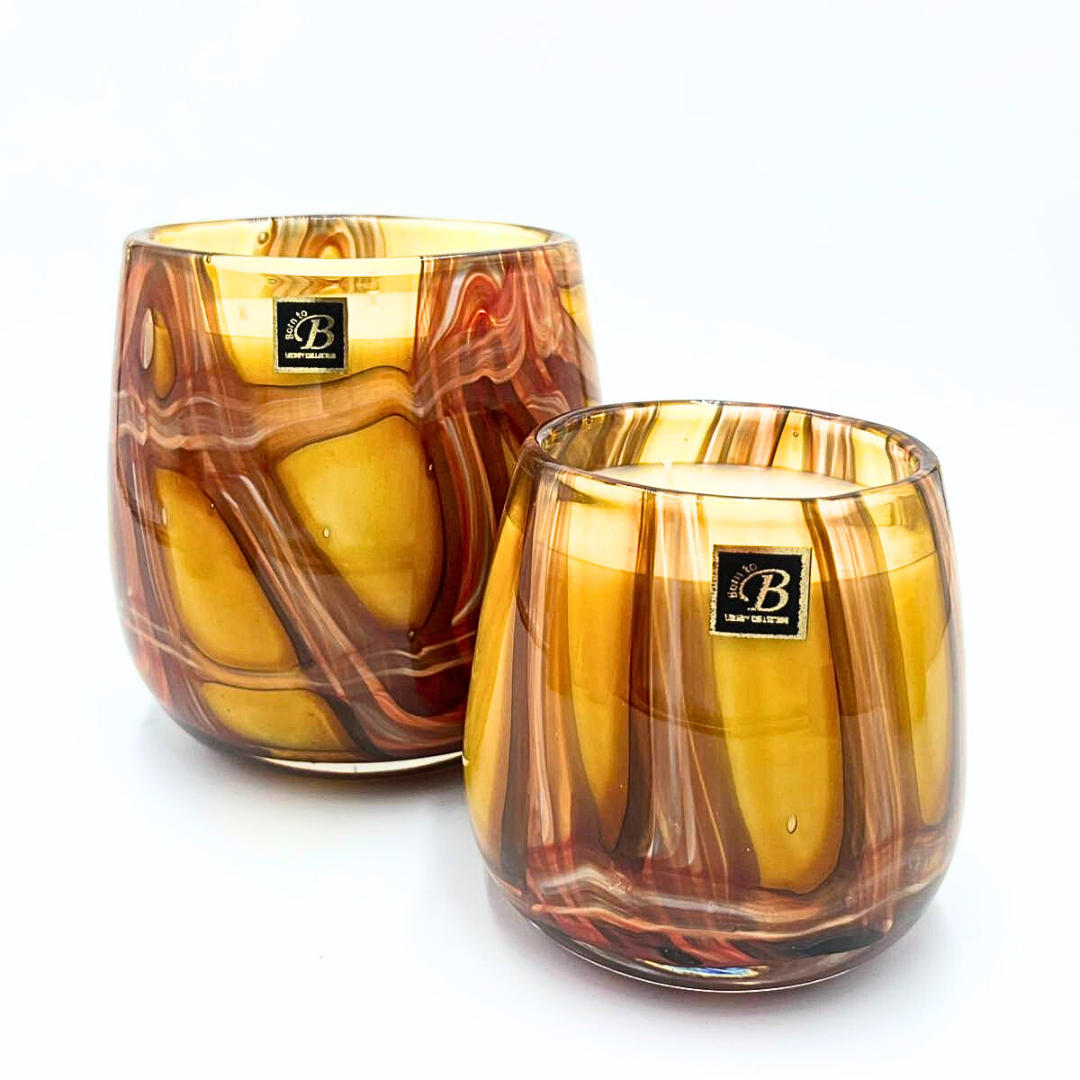 Coulée dans un verre soufflé artisanal aux reflets ambrés, la bougie Sahara est une véritable pièce de décoration. Chaque contenant est unique, marbré de caramel, orange brûlé, brun chaud et doré, évoquant la lumière et la chaleur minérale des paysages désertiques.