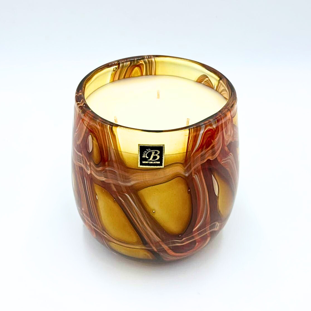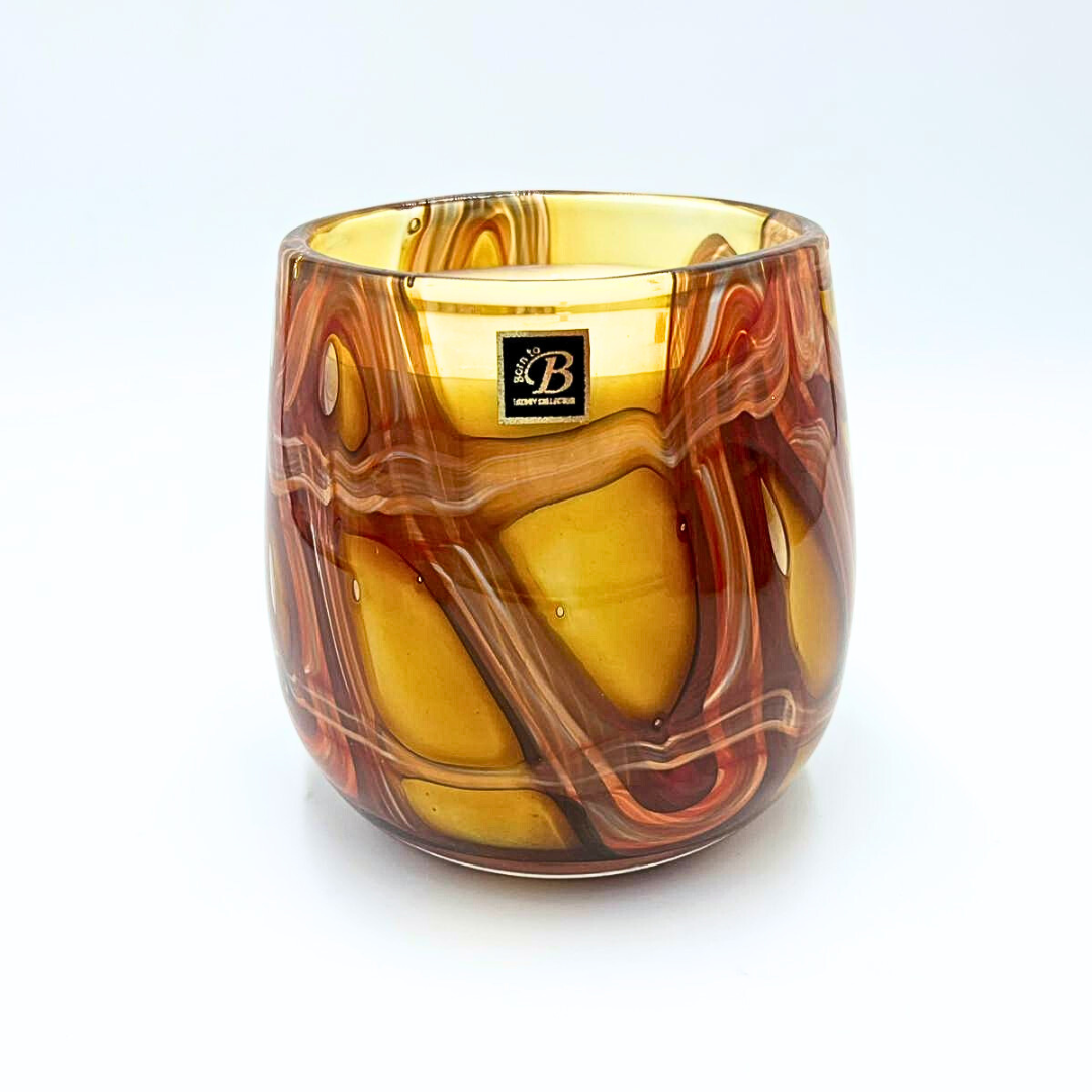 Coulée dans un verre soufflé artisanal aux reflets ambrés, cette bougie est une véritable pièce de décoration. Chaque contenant est unique, marbré de caramel, orange brûlé, brun chaud et doré, évoquant la lumière et la chaleur minérale des paysages désertiques.