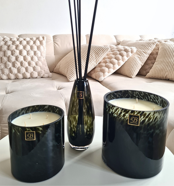 X-Large – Ø 15 cm / H 15 cm – 2950 gr (dont 1600 gr de cire parfumée) - 5 mèches en coton naturel → 280-300 h de combustion.