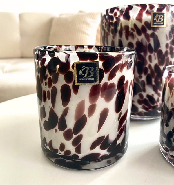 Son verre marbré mêle subtilement les nuances de bordeaux, de noir et de blanc, évoquant la sérénité nordique et la lumière d’un hiver chic.