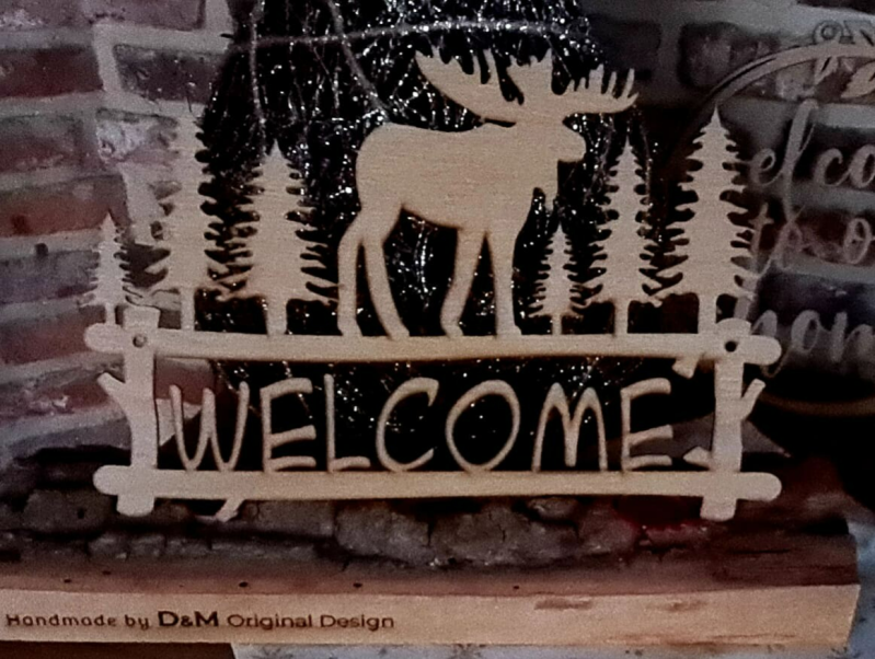 Motif "Welcome" avec élan et sapins. Avec accroche prédécoupée