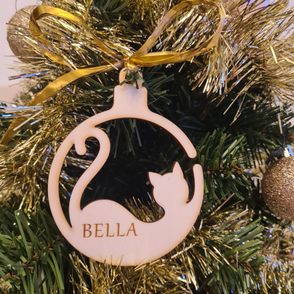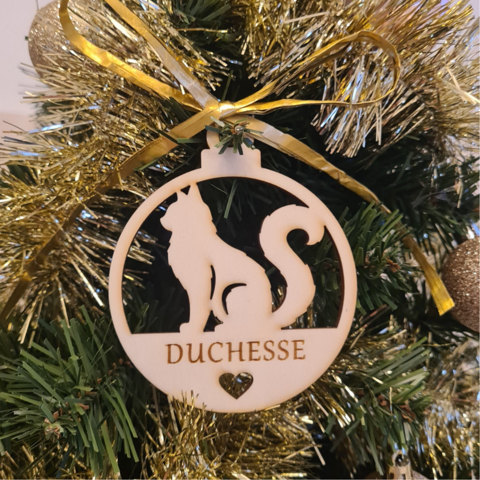 Boule de Noël en bois naturel de peuplier clair de 3 mm avec gravure de prénom au choix.