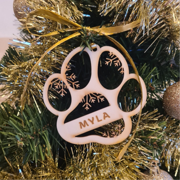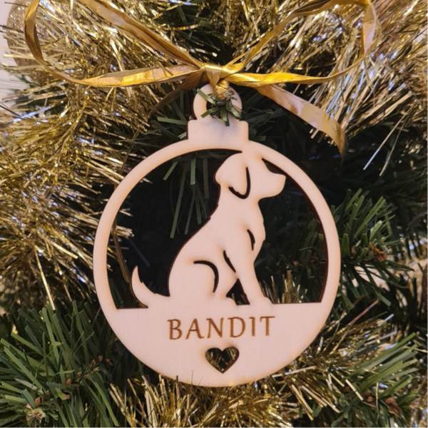 Boule de Noël en bois naturel de peuplier clair de 3 mm avec gravure du prénom de votre chien.