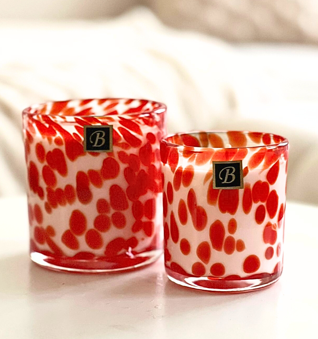 Coulées à la main en cire de soja 100 % végétale et enrichies de 10% de parfum our, ces bougies parfumées artisanales en verre marbré de la Red Love Collection offrent une combustion propre et durable, diffusant un parfum riche, sensuel et enveloppant.