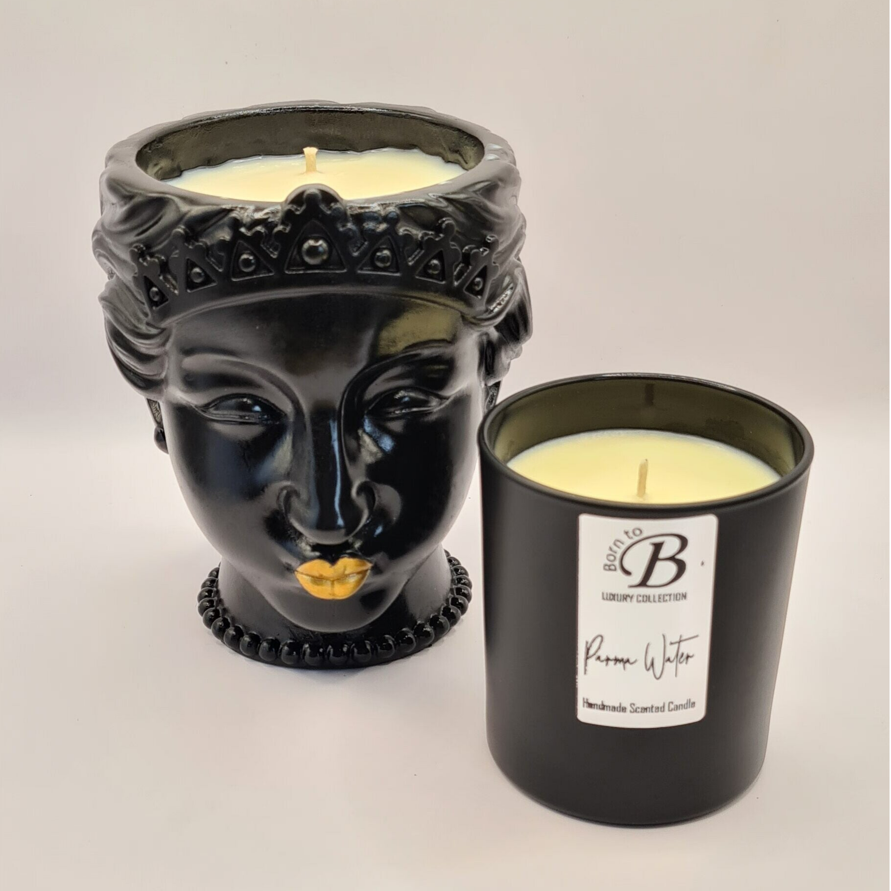 Notre bougie Born to B a Queen est une édition limitée présentée dans un contenant en céramique en forme de tête de reine noire avec une bouche dorée.