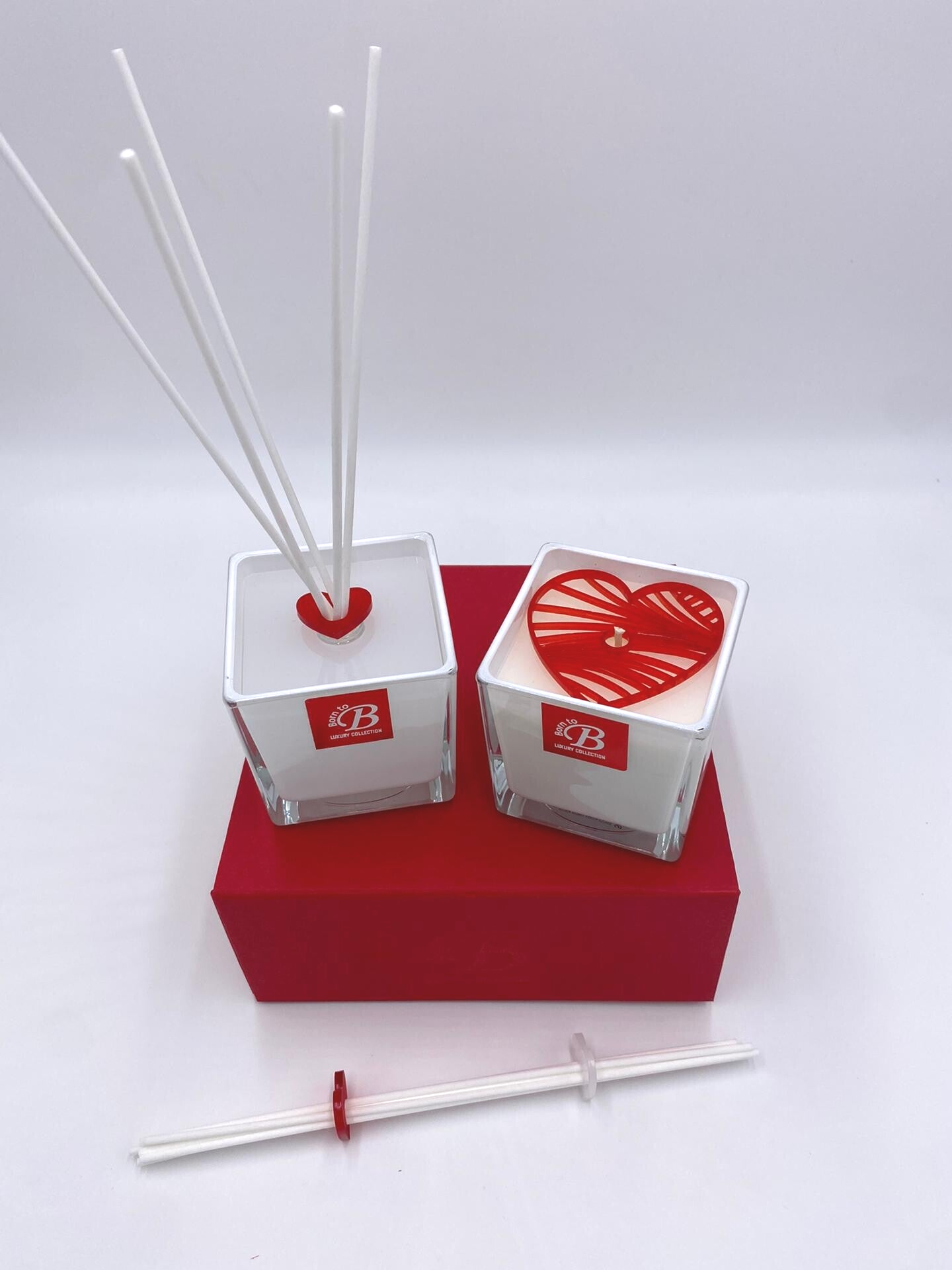 Een cadeauset bestaande uit een stick diffuser en de bijbehorende handgemaakte kaars met een unieke Valentijnsgeur, gemaakt in onze werkplaatsen met de parfums van Grasse.